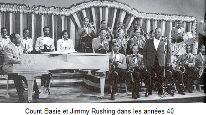 Parallèlement, phénomène toujours lié à l’activité des gangs et de la politique locale réunies, Kansas-City, grosse cité du Middle-West, est devenue un foyer musical de première importance, où les musiciens sont attirés par la multiplication des clubs de jazz et où le blues est très présent. Le musicien qui incarne le mieux cette présence fusionnelle du blues dans le jazz est le trompettiste Lips Page, vedette de l’orchestre de Benny Moten, dont le pianiste Bill Basie deviendra Count en succédant à son leader prématurément disparu, élu par ses collègues à la tête d’un grand orchestre qui, lui aussi, tiendra la distance. On doit aussi à cet endroit trépidant l’expansion du boogie-woogie, dont le pianiste Pete Johnson est un représentant emblématique et l’émergence des blues shouters Jimmy Rushing et Big Joe Turner. En fin de compte, tout ce beau monde ou presque se retrouvera en orbite autour de Harlem, où s’exprime aussi un style particulier de piano issu du ragtime, le « stride », dont les trois légendes sont James P. Johnson, Fats Waller et Willie « The Lion » Smith.