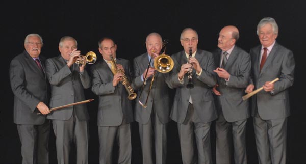 Cave du HCF rue Pavée à Paris Daniel Huck (cl) Jean-Pierre Morel (cnt) Dan Girard (bjo) Raymond Fonsèque (tb) © Photo X